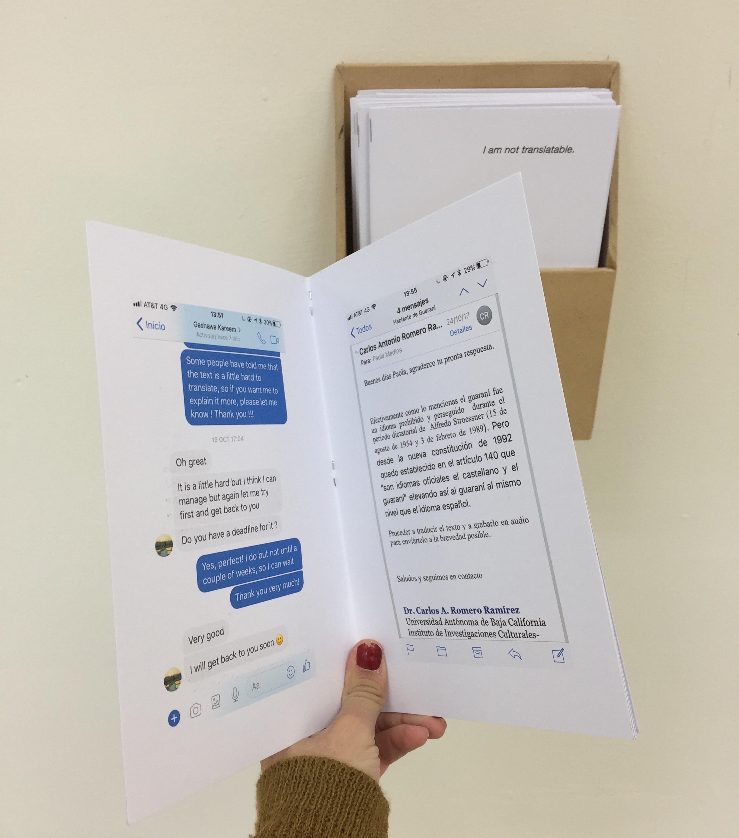A través de una convocatoria en redes sociales, se contactaron hablantes de Catalán, Vasco, Guaraní, Cree, Kurdo, Romaní, Maya y Zulu; idiomas que tienen cierto caracter de resistencia lingüística. Éstos colaboradores tradujeron de forma oral y escrita el siguiente statement: "Linguistic practices are sites of struggle.They are sites where identity, community, access, opinion and visibility are fought for. Where the posibility to simply be is fought for. Language can’t be neutral and I am not translatable. As I speak I construct myself, I construct them and I construct you". Se presentaron los audios de las voces de estos hablantes y un cuadernillo donde se describe el proceso de contacto y comunicación.